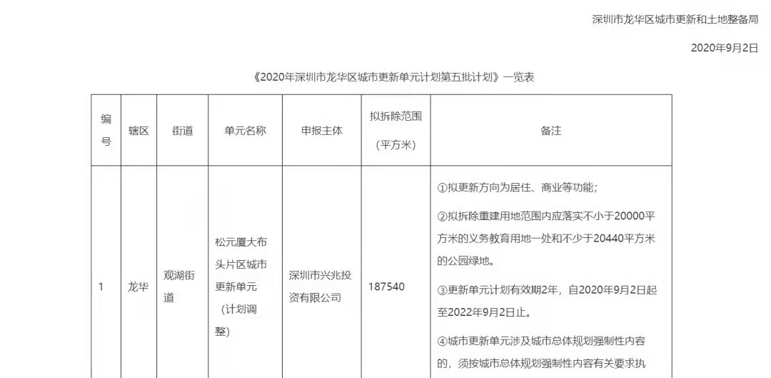 观澜大布头片区城市更新项目:该项目被纳入《2015年深圳市城市更新单元计划第二批计划》,更新单元规划(草案)已经2020年龙华区城市更新工作领导小组第四次会议审议;申报主体为深圳市兴兆投资有限公司,该公司为福晟集团旗下全资子公司。