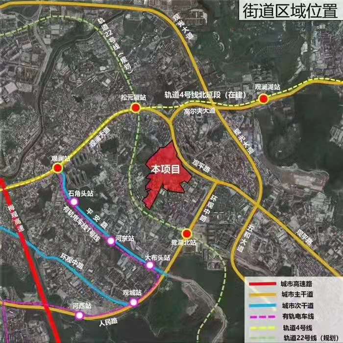 项目位于观湖街道观平路与环观中路交汇处西北侧,地处深圳中轴,龙华副中心,项目距离地铁4号线松元厦站500至1000米。更新单元用地面积199271.4㎡,拆除范围用地面积187540.1㎡,其中开发建设用地面积106948.3㎡。更新单元规划容积663630㎡。