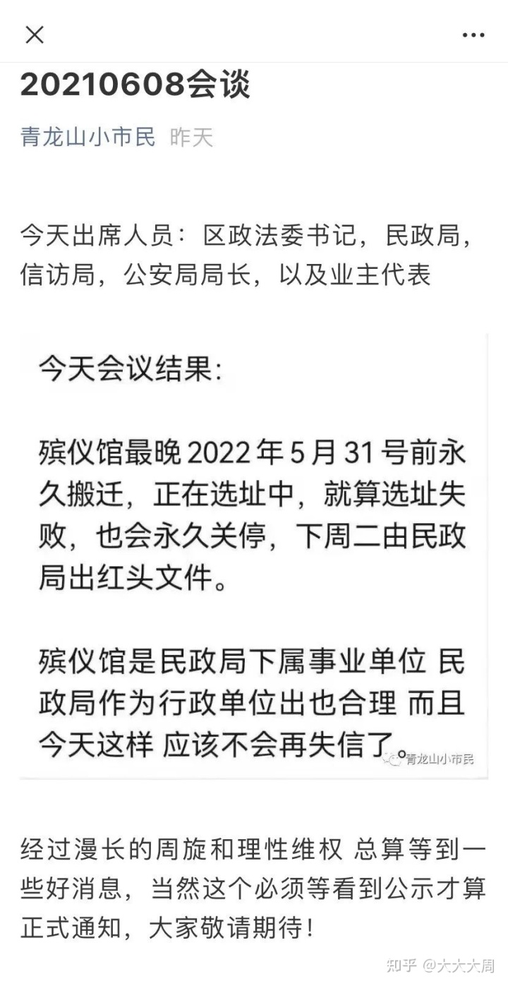上周五就有最新消息称,由区政法委书记、房管局、地税局、公安局局长及物业公司代表参与的会议上,就灵山灵堂迁址事项达成一致,灵堂最晚2022年5月31号前永久性迁址,正在迁建中,就算迁建失败,也会永久性关停,下周二由房管局出贴子。
