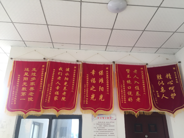 一进门,一排致谢牌匾挂在会议厅醒目位置。内容有“宿迁日光养老保险院,我们老人家幸福家”、“保滩日光,幸福之光”等,落款为赣榆县各乡镇人士。