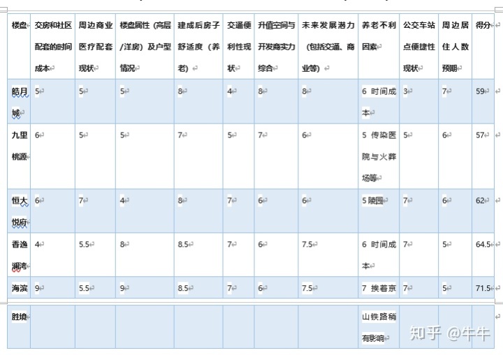 那么到底哪个盘适合我?这是最终的问题。因此我简单建了一个基于养老房子选择的指标体系,综合性评分。单项10分。负面不利因素得分低,正面不利因素得分高。